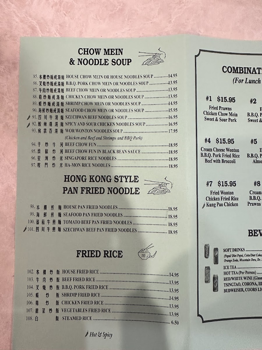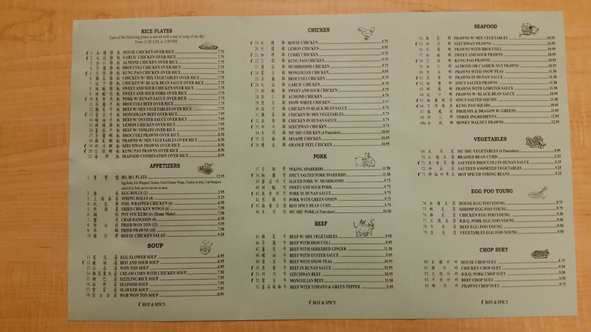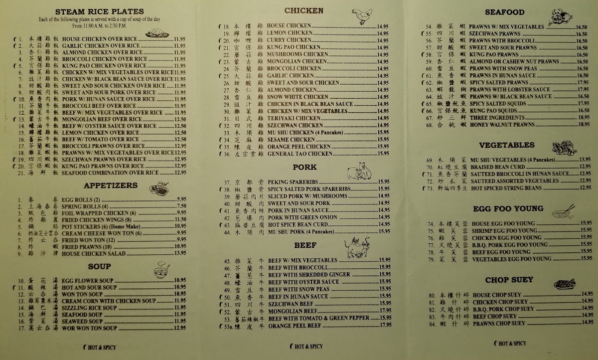 This menu is suitable for lunch or dinner and supports casual dining occasions where guests may choose from a range of cooked-to-order dishes. The structure allows for quick ordering of individual entrees or combination plates, accommodating both small groups and individual diners seeking traditional Chinese flavors.